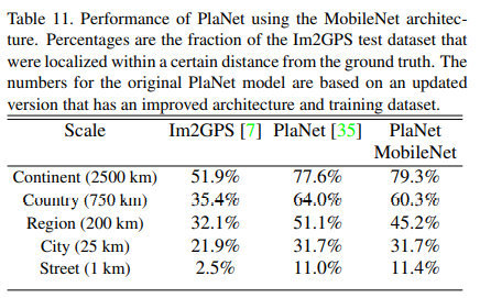 可以看到相比之际,基于MobileNet的PlaNet,在仅有1300W参数的情况下,与基于Inception V3的PlaNet(5200万参数),性能只是稍微降低。