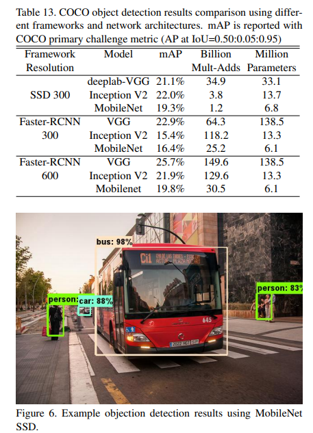 在Faster-RCNN和SSD框架下,将MobileNet、VGGInception V3进行比较。其中SSD的输入分辨率调整为300,Faster-RCNN分别为300和600,结果如下表所示。