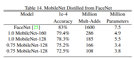 FaceNet 是现阶段最先进的人脸识别模型,它基于三重态损失(tripleloss)构建面部嵌入。了建立移动FaceNet模型,使用蒸馏来通过最小化 FaceNet和MobileNet在训练数据上的输出的平方差来进行训练。基于MobileNet和蒸馏技术训练出结果如下。