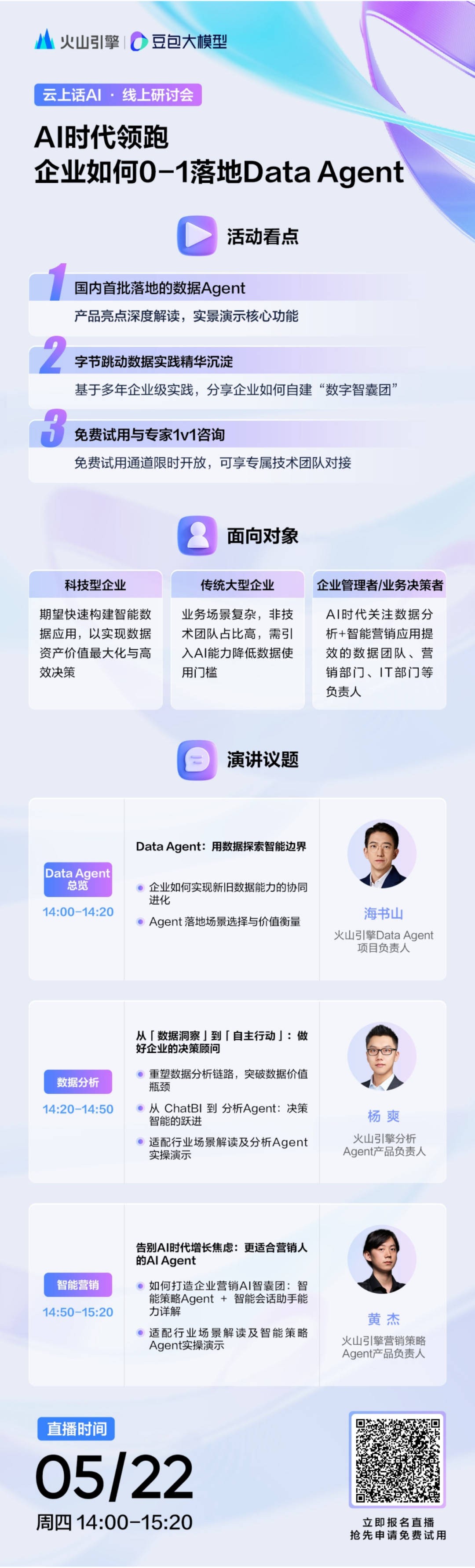 5月22日14:00,火山引擎数智平台的专家们将首次全面解读 Data Agent 产品全景及核心应用场景,展示企业如何轻松构建可自主进化的数据大脑,深度挖掘数据资产价值,降低使用门槛,实现高效决策与价值释放。