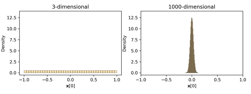 也就是说,我们既没有读取任何数据,也没有进行任何计算,就会发现高维向量空间中,维度越高, x[0] 的不确定性越低:其可能的取值范围从 [−1,1] 缩小到了