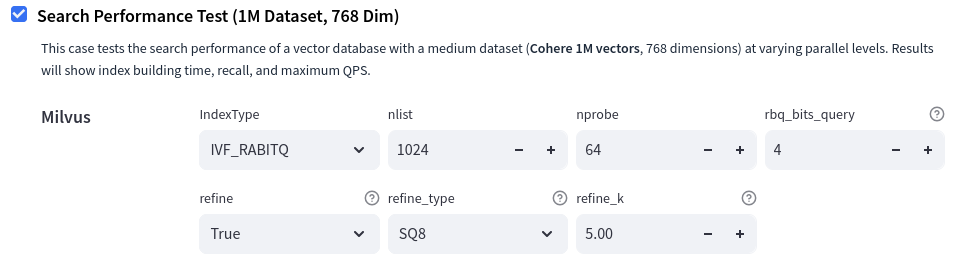 简而言之,如果希望在“可接受的召回率”下最大化吞吐量,IVF_RABITQ 是一个非常优秀的选择;而在搭配 refinement 后,效果更佳,不仅大幅提升了性能与准确率,同时所占内存相比 IVF_FLAT 更小,非常适合对速度和精度都有要求的场景。