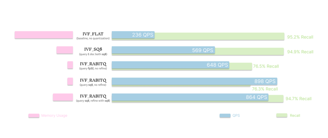 结果显示,经过精调的IVF_RABITQ 带来了显著的性能提升。与基线索引 IVF_FLAT 相比(该索引在 95.2% 召回率下达到 236 QPS),IVF_RABITQ 在吞吐量上有显著优势——在使用 FP32 查询时可达 648 QPS,而在配合 SQ8 量化查询时更是达到 898 QPS。