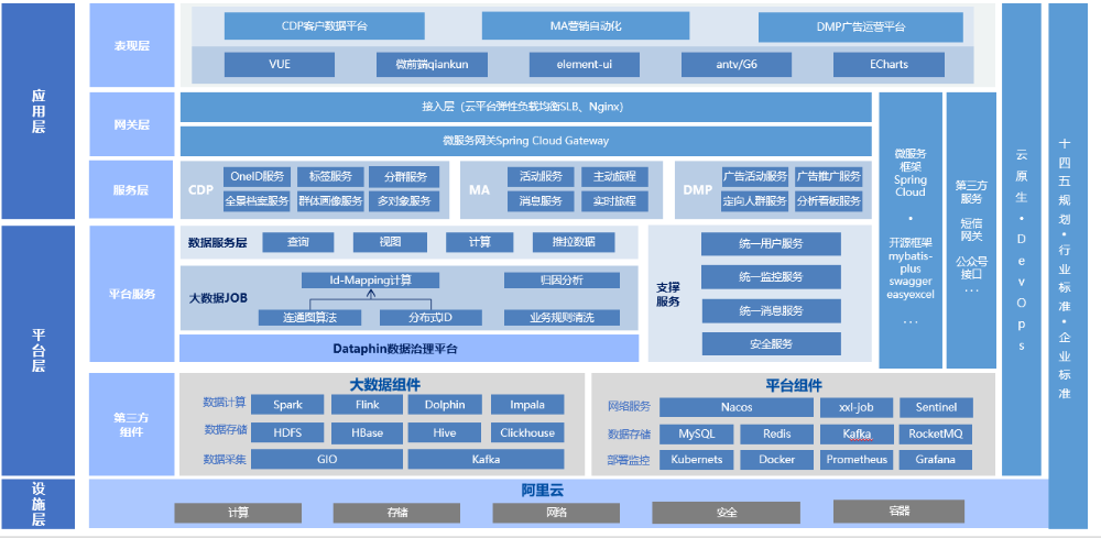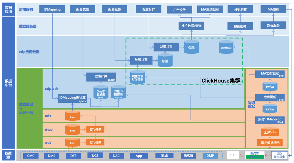 这些数据经过Flink和Spark的清洗后汇聚到宽表中进行存储,并用于支持后续的标签圈选、客户画像、归因分析等场景,辅助营销部门进行决策,同时生成实时看板和报表用于观察广告及其他营销行为的投放效果。
