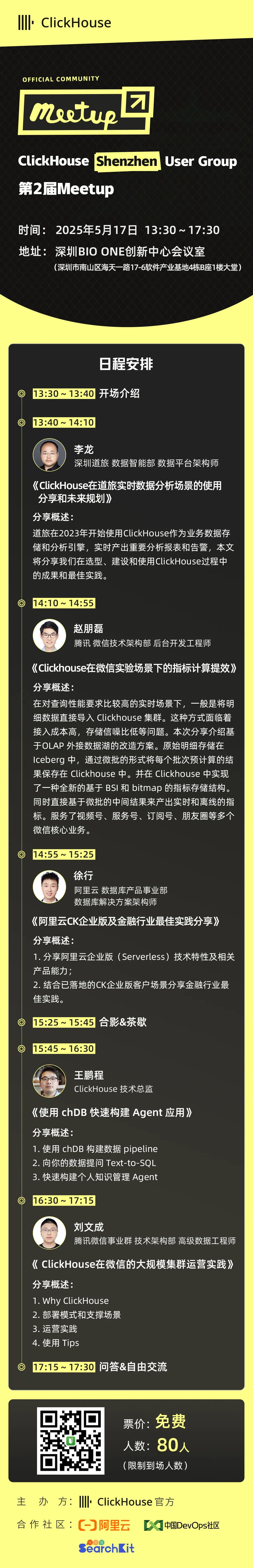 好消息:ClickHouse Shenzhen User Group第2届 Meetup 火热报名中,将于2025年05月17日在深圳BIO ONE创新中心会议室(深圳市南山区海天一路17-6软件产业基地4栋B座1楼大堂)举行,扫码免费报名
