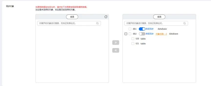从实际业务需求出发,在CDC任务中提供2种对象选择方式:整库和部分表选择。通过对象选择,过滤冗余的源库日志数据,减少磁盘空间占用。