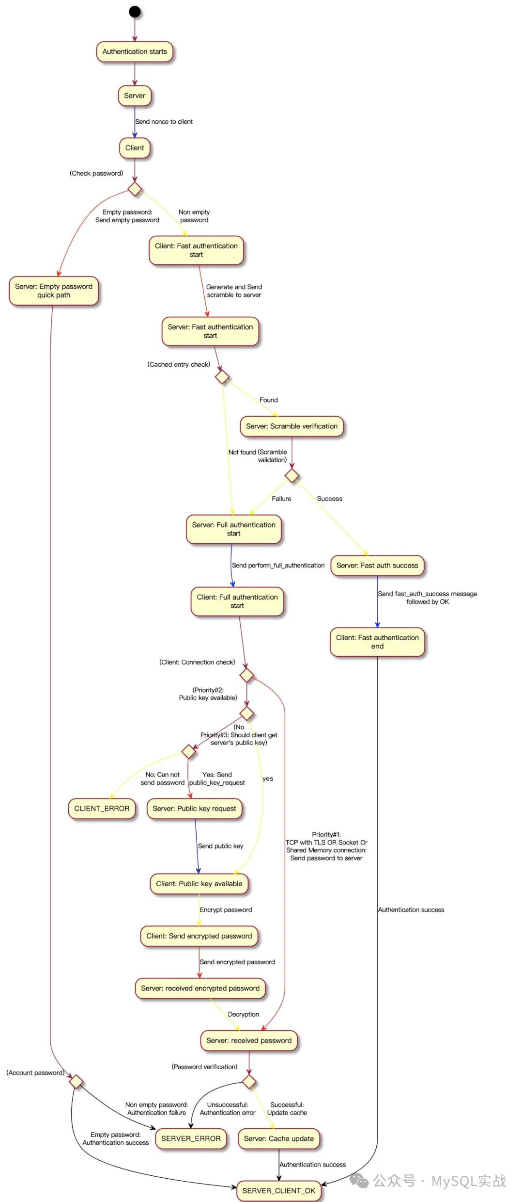 以下是客户端与服务端使用 caching_sha2_password 插件进行身份认证时的完整交互流程:
