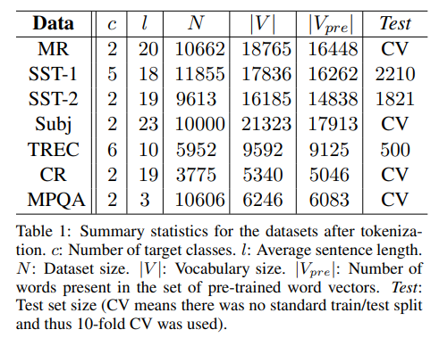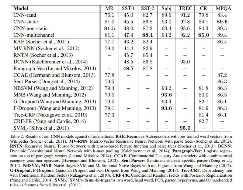 CNN-rand:所有词向量随机初始化,从头开始训练模型。 CNN-static:使用预训练词向量,没有预训练词向量的词随机初始化,且不更新词向量。 CNN-non-static:同static,只是词向量更新。 CNN-multichannel:具有两组词向量的模型。每组向量都被视为一个“通道”,每个过滤器都应用于两个通道,但梯度仅通过其中一个通道进行反向传播。因此,该模型能够微调一组向量,同时保持另一组向量的静态。两个通道都用 word2vec 初始化。(没太明白)