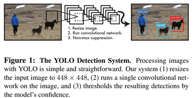 该篇文献,将目标检测和识别看作回归问题,直接从图像像素分析得到边界框坐标和类别概率,只需要在图像上看一次(YOLO),就能预测目标的位置和类别。其大致流程主要为,图像调整到合适尺寸,输入到单个卷积神经网络中,利用模型计算的置信度对所得到的检测结果进行阈值处理。