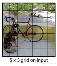 这里还需要考虑一个情况,就是如果物体很大,每个grid又很小,物体被多个grid识别出来怎么办?这就需要采用非极大值抑制,例如下图中狗狗,在B1,B2,B3,B4中都识别到狗狗,但是最终是输出应该只有一个框,其他框需要删除。这就需要用到置信度,confidence预测有多大的把握这个物体在我的框里,也就是B1,B2,B3,B4中,选择confidence最大的,把其余的都删掉,也就是保留B1。