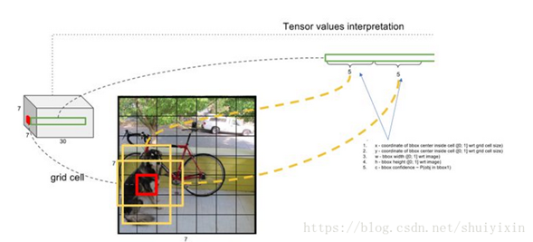 YOLO的预测是基于整个图像,并且它会一次性输出所有检测到的目标信息,包括位置和类别。就好像捕鱼,R-CNN是先选好哪里可能出现鱼,而YOLO是直接一个大网下去,把所有的鱼都捞出来。为便于理解,这里对YOLO预测的bounding box的5个系数的细节信息进行解释。