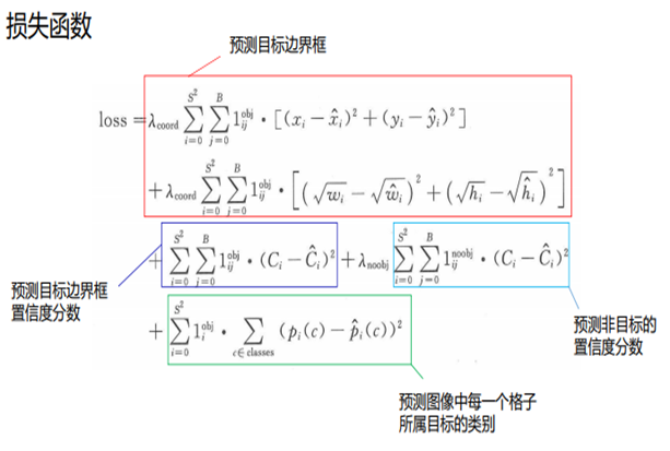 YOLO的损失函数分为4项,前2项计算预测目标边界框的损失,第3项计算预测目标边界框的置信度损失,第4项计算预测非目标的置信度损失,第5项计算预测图像中每个gird所属目标类别的损失。