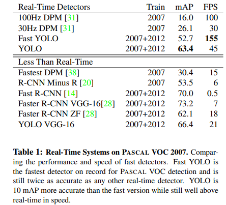 在与非实时目标检测系统比较,例如R-CNN系列。YOLO虽然在精度上低于5%左右mAP,但是速度上是优于其他所有的方法。
