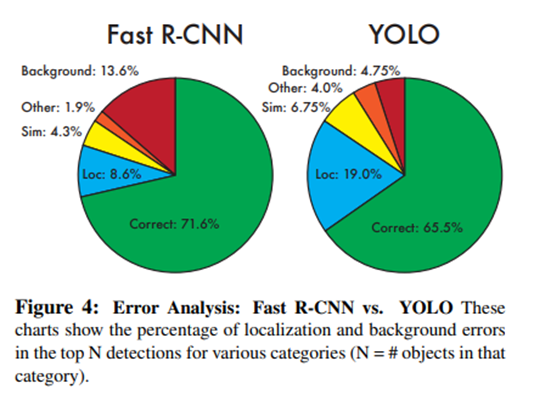 从右图结果中可以看到,YOLO的背景误检率低于Fast R-CNN,但是其定位精度错误率高于Fast R-CNN,且定位精度错误率比其他错误源加起来都多,YOLO在定位精度上还需要再优化。