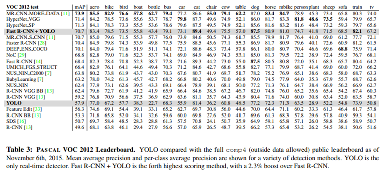 在VOC 2012测试集上,YOLO的mAP为57.9%,低于现有的最新的方法。但是Fast R-CNN + YOLO的联合模型,是评分第四的方法,比仅使用Fast R-CNN提高2.3%。目前YOLO的优势在于高速度和中等精度。