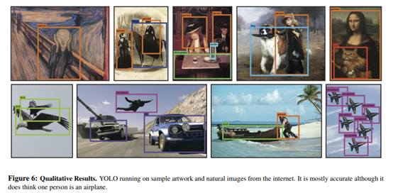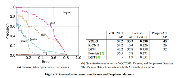 所有的方法都在VOC 2007预训练,下图结果可以看到, YOLO是在VOC 2007和其他两个数据集上精度相差较小。而R-CNN虽然在VOC 2007精度与YOLO差不多,但是迁移到Picasso和People-Art数据集上精度下大幅度下降。