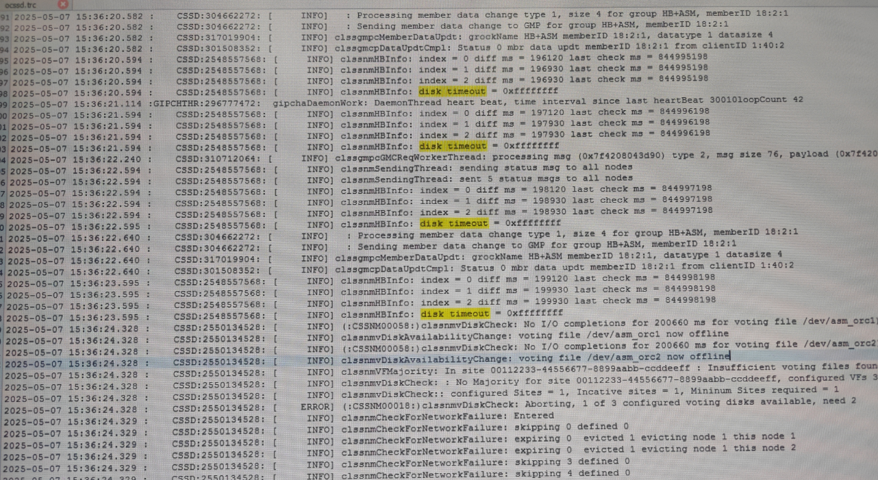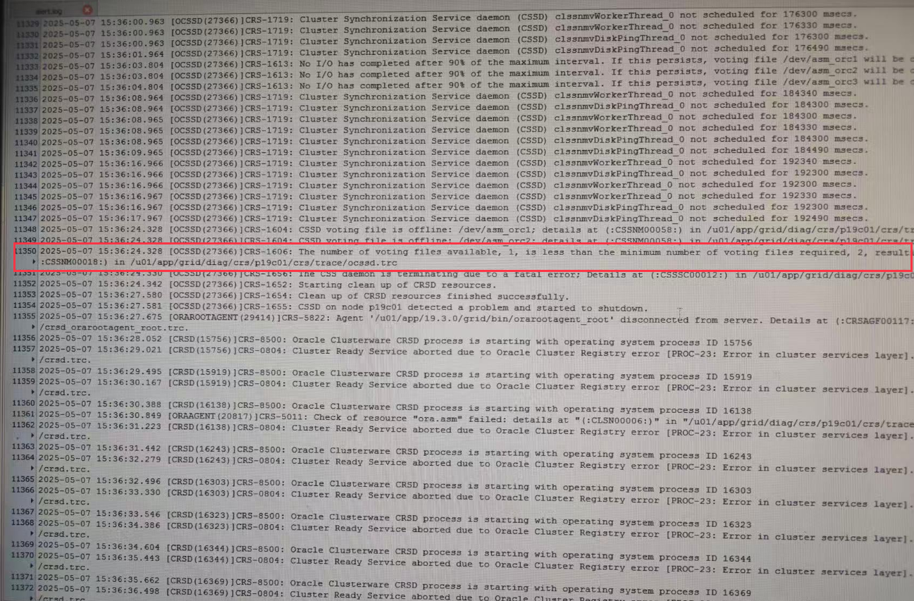 The number of voting files available, 1, is legs than the minimum number of voting files reguired, 2, resultcrs/p19c01/cr3/trace/ocssd.trc