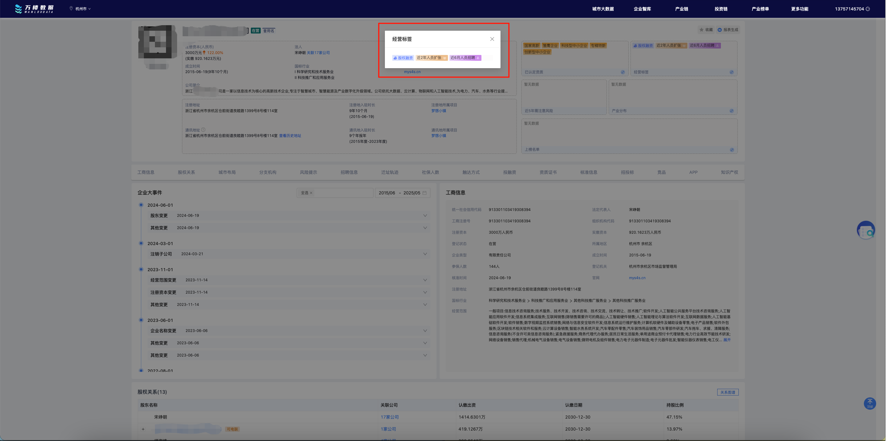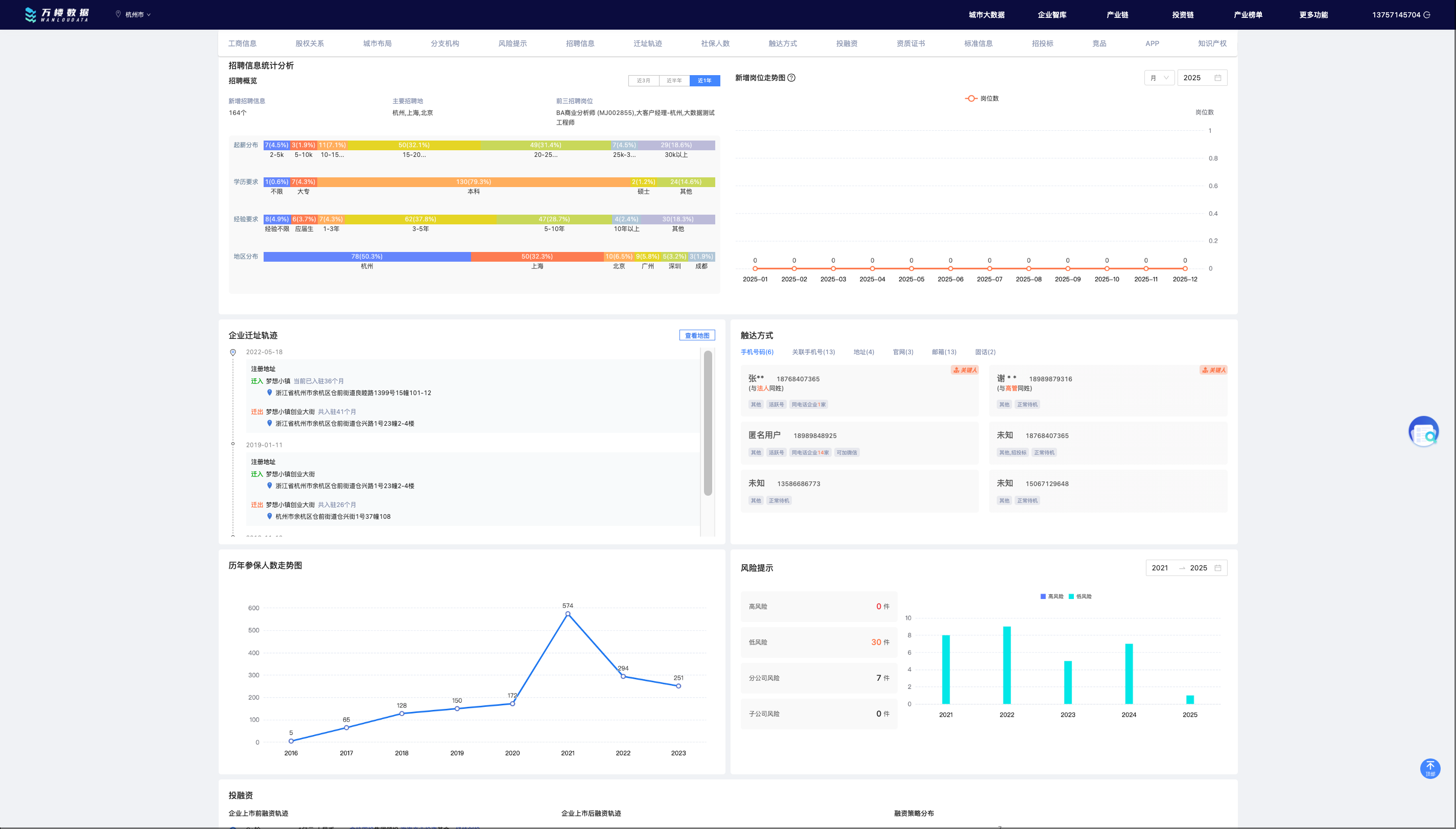 在获得迁址路径的同时,万楼数据还提供对迁入企业的深度画像分析,包括企业规模、招聘频次、社保人数变化、融资动态等多项指标。