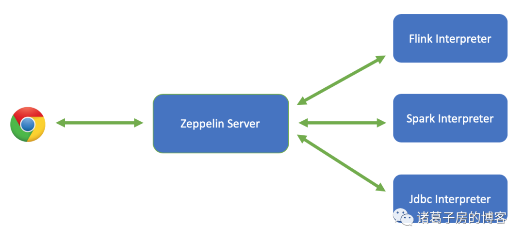 Zeppelin前端负责前端页面的交互,通过Rest API 和WebSocket的方式与Zeppelin Server进行交互。Zeppelin Server是一个Web server,负责管理所有的note,interpreter 等等,Zeppelin Server不做具体的代码执行,会交给Interpreter来执行代码Interpreter 是一个独立的进程,负责具体前端用户提交的代码的执行(比如Spark Scala代码或者SQL代码等等)。Zeppelin Server与 Interpreter 自己是通过thrift 来进行通信,而且是双向通信。Zeppelin支持目前大部分流行的大数据引擎,上图只展示了其中3种比较常用的引擎:Flink,Spark,Jdbc