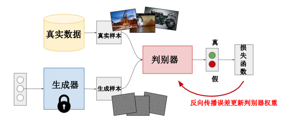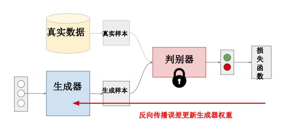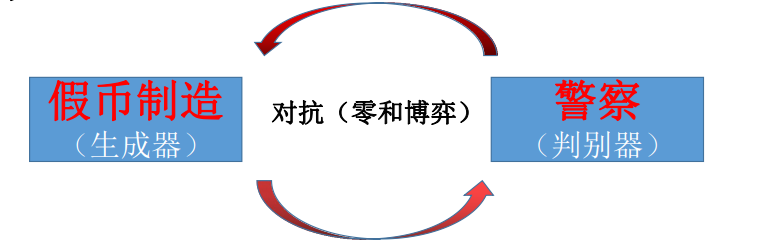 用作者原文中的所举例来理解就是,生成器可以被认为是假币伪造者,判别器是鉴别警察,试图发现假币。两者相互竞争,不断学习优化,直到判别器(警察)无法再辨别出数据(假币)是来源于真实的,还是生成的。