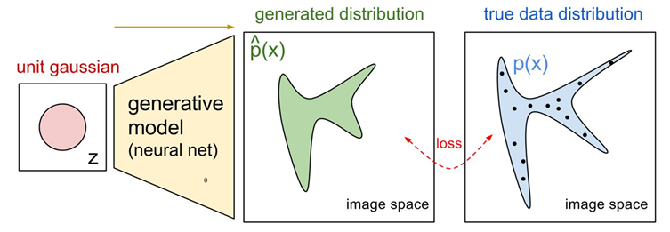 以极大似然估计解决深度生成模型为例,该方法可以看做是最小化真实数据分布和模型分布之间的KL散度(一般KL散度越小,两个模型越相似)。一般我们假设数据分布在某个指定的生成模型中,比如混合高斯模型,但是这样假设的模型不够去拟合一个真实的数据分布,所以需要深度神经网络这样的强大模型去拟合一个复杂的分布。