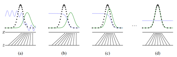 蓝色虚线代表判别器判别概率的分布;黑色点线代表真实数据分布;绿色实线代表生成数据分布;下方z是噪声,x是真实数据;z到x的箭头代表生成器到真实数据映射x=G(z)。