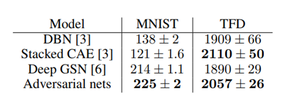 经过训练后的对抗网络,获得其生成器,对生成器G生成的样本应用高斯Pazren窗口计算此分布下的对数似然,来估计测试集数据的概率。其结果如下表所示。