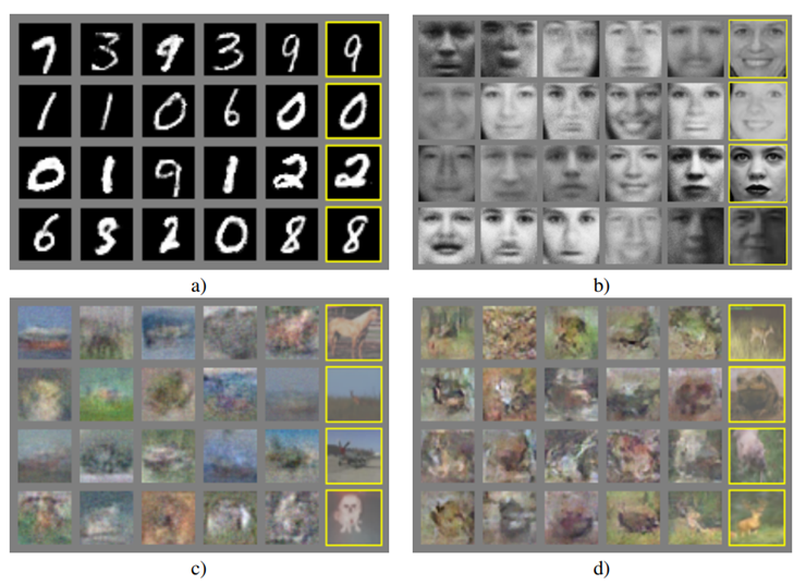 可以看到对于简单数字和人脸图像,a) MNIST和 b) TFD,其生成模型生成的数据已经逐渐逼近真实数据。但是c) d) CIFAR-10的复杂自然图像,还是存在缺少轮廓和纹理信息细节等。