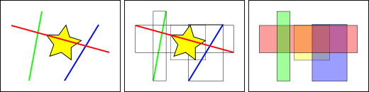 数据库有效回答“哪些线与黄星相交”问题的方式是,首先使用索引(非常快速)回答“什么框与黄框相交”问题,然后对“哪些线与黄星相交”进行精确计算。