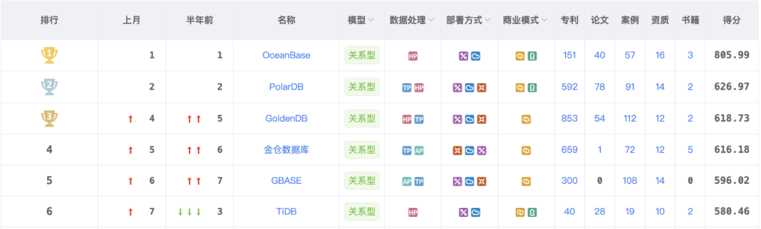 OceanBase 以 805.99 分强势登顶,领先第二名超过 100 分。凭借在性能优化、系统稳定性及国产化适配等方面的持续突破,OceanBase 本月再度刷新得分纪录,展现出其在企业级数据库领域的卓越竞争力。与此同时,本月共有四款数据库产品实现排名上升,体现出国产数据库市场竞争日趋激烈,产品创新与迭代节奏不断加快。
