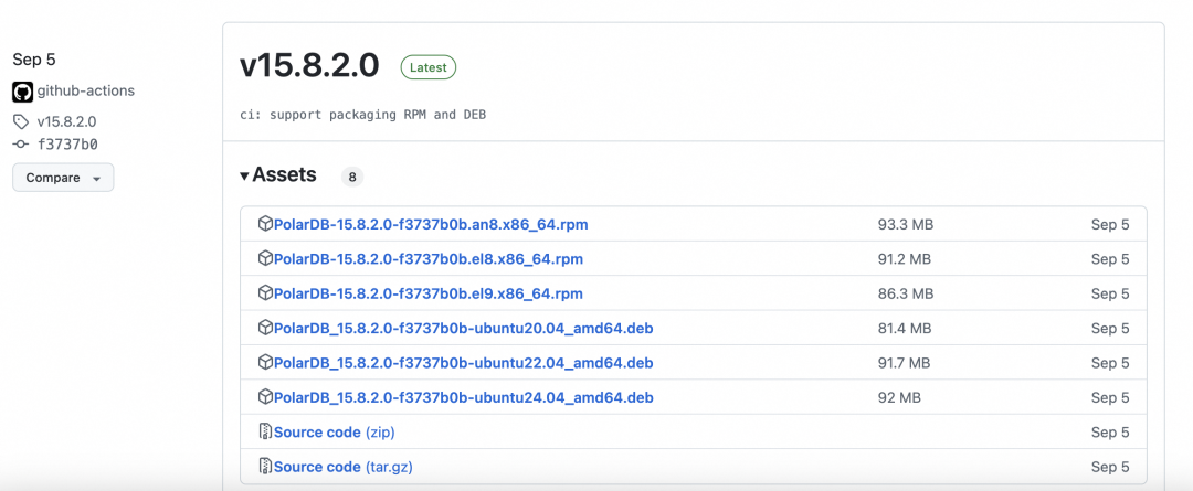 从github上下载开源PolarDB-PG15的rpm包,并在每台机器上安装。这里使用的是Centos 8系统,因此下载el8的包即可(https://github.com/ApsaraDB/PolarDB-for-PostgreSQL/releases)