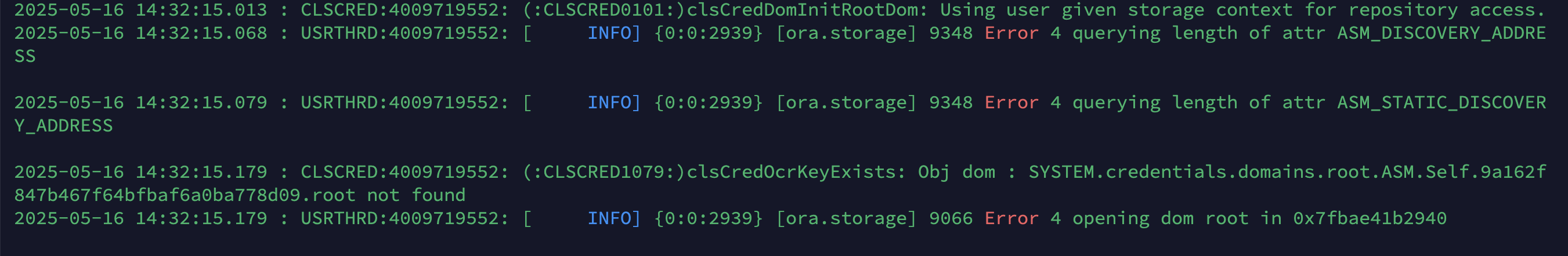 [grid@db01:/home/grid]$ crsctl get credmaint -path /ASM/Self/9a162f847b467f64bfbaf6a0ba778d09 -credtype userpass -id 0 -attr passwd -local