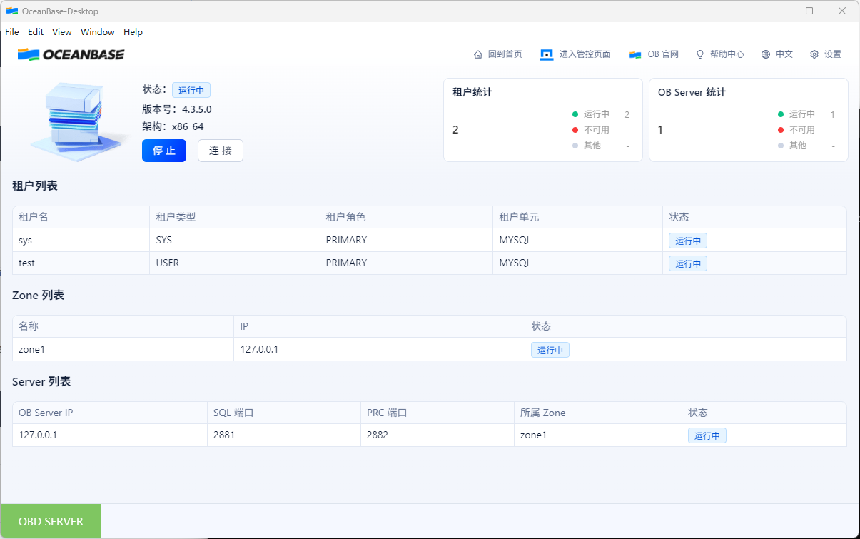 能看到的是,内置的OB内核是最新的4.3.5社区版,需要额外注意的是,两个租户的root密码都是空,建议初次登陆重置