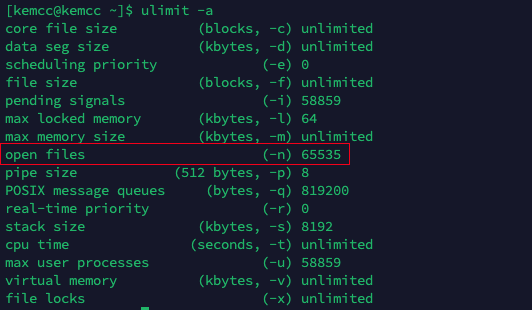 完成修改后,切换到 kemcc 用户再次通过命令 ulimit -a 检查配置是否生效。