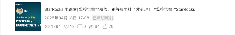 4 月 16 日,StarRocks 小课堂邀请镜舟科技 DBA 团队负责人景丹,深入解读监控告警前的核心要点,涵盖: