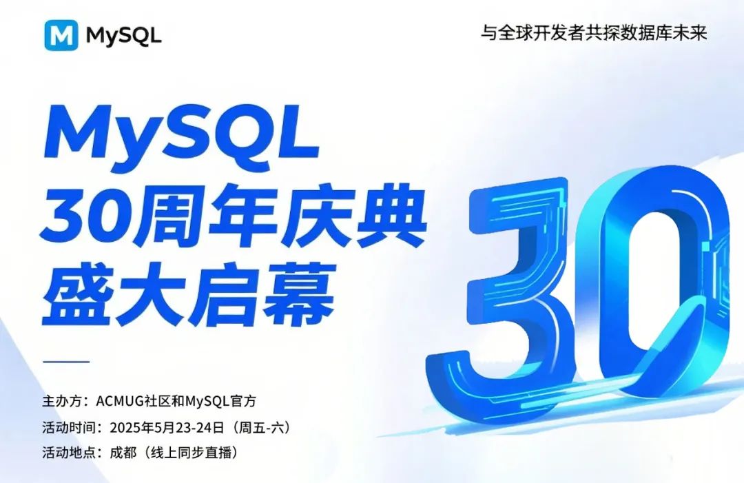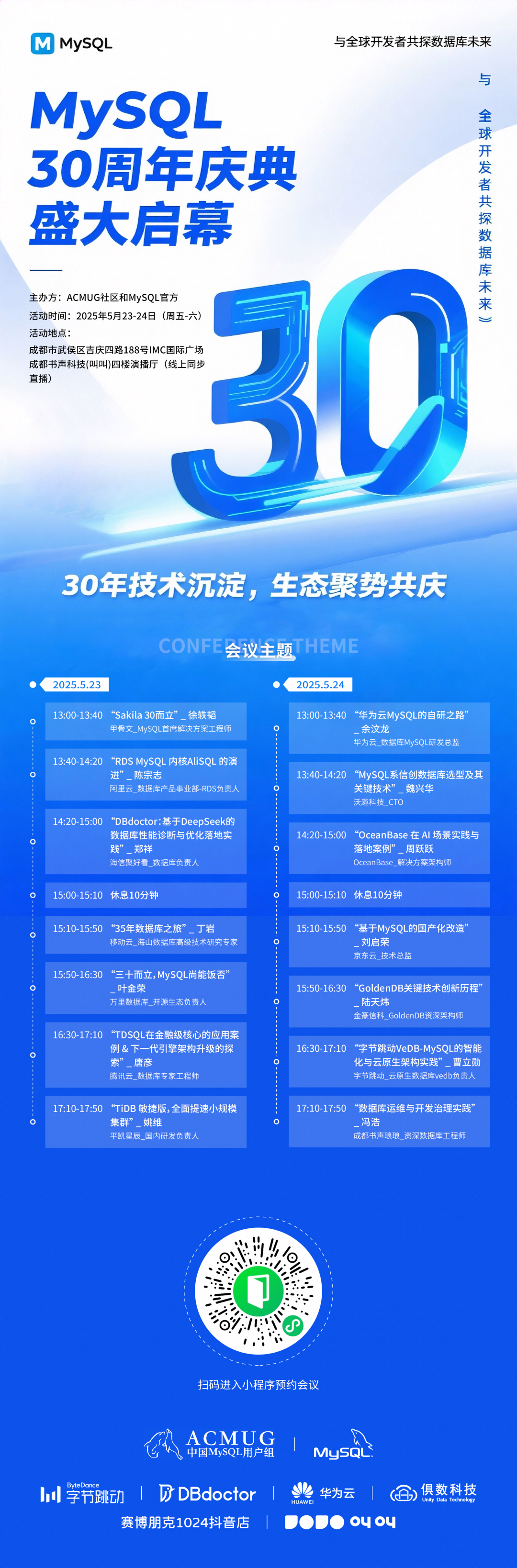 5月23日-24日,由ACMUG社区与MySQL官方联合举办的『MySQL 30周年庆典』将在成都盛大启幕。本次大会以“代码永恒,开源无界”为主题,汇聚MySQL核心团队、云厂商技术领袖、国产数据库先锋及行业解决方案专家,共同探讨MySQL的技术演进与未来趋势。