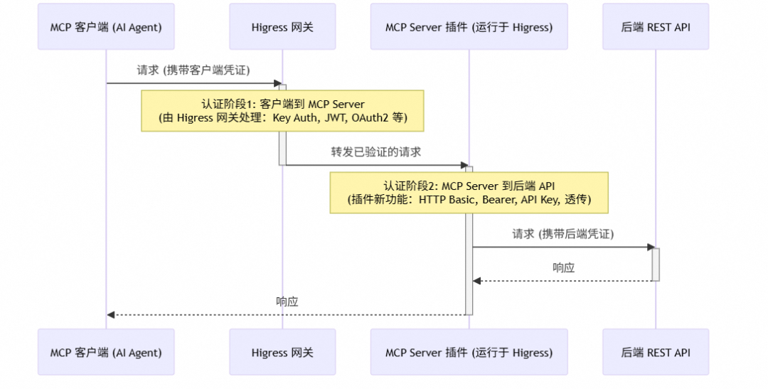 客户端到 MCP Server 的认证:这是指 MCP 客户端(例如 AI Agent)对 Higress 网关上托管 MCP Server 的端点进行的认证。Higress 为此阶段提供了强大的网关级认证机制,例如 Key Auth、JWT Auth 以及 OAuth2 支持。这些现有的 Higress 功能确保只有授权的客户端才能访问您的 MCP Server。 MCP Server 到后端 API 的认证:一旦授权客户端调用某个 MCP 工具,MCP Server 插件本身可能需要向该工具所代理的最终后端 REST API 进行认证。