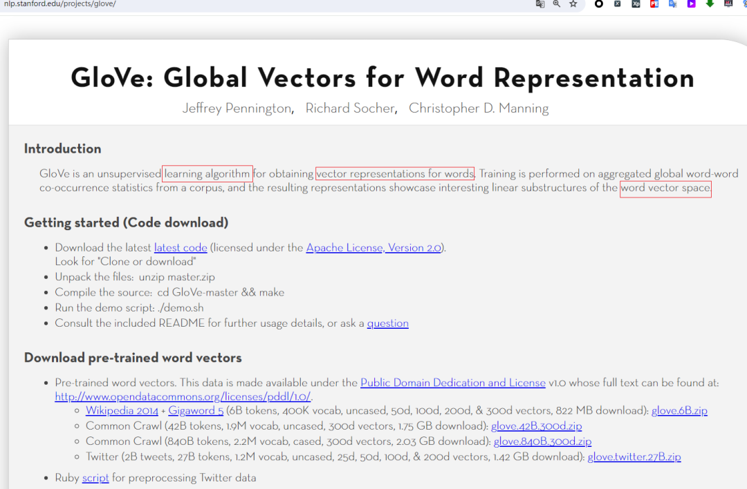 GloVe 是由斯坦福NLP团队开发的词向量模型,通过在大规模文本语料库(如Wikipedia或Common Crawl)上训练生成。每个单词被表示为一个密集向量(例如50维、100维或300维),这些向量能够捕捉单词的语义信息。