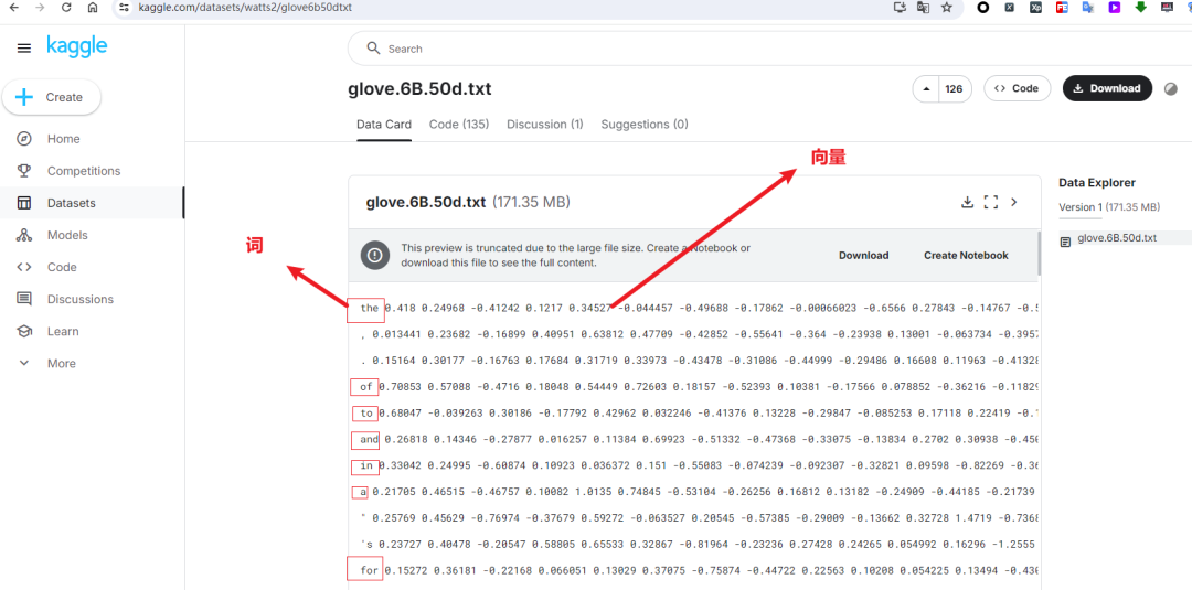 第一列:单词(例如“the”、“dog”)。 其余列:50个浮点数,表示该单词的向量。