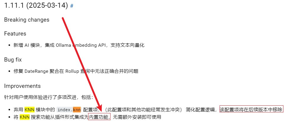 要使用 Easysearch 的 kNN 检索功能,早期版本需确保已安装 knn 插件。具体安装步骤可参考官方文档的“插件安装”部分。 特别说明的是:1.11.1(含)之后的新版本已经不需要额外安装!