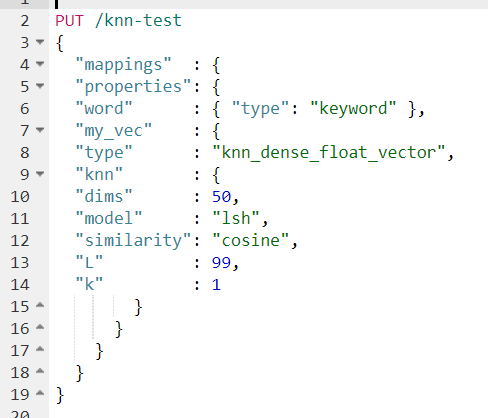 PUT my-index{"mappings": {"properties": {"my_vec": {"type": "knn_dense_float_vector","knn": {"dims": 50}}}}}