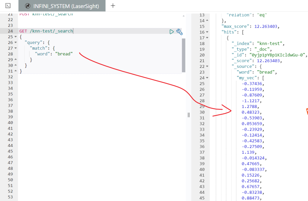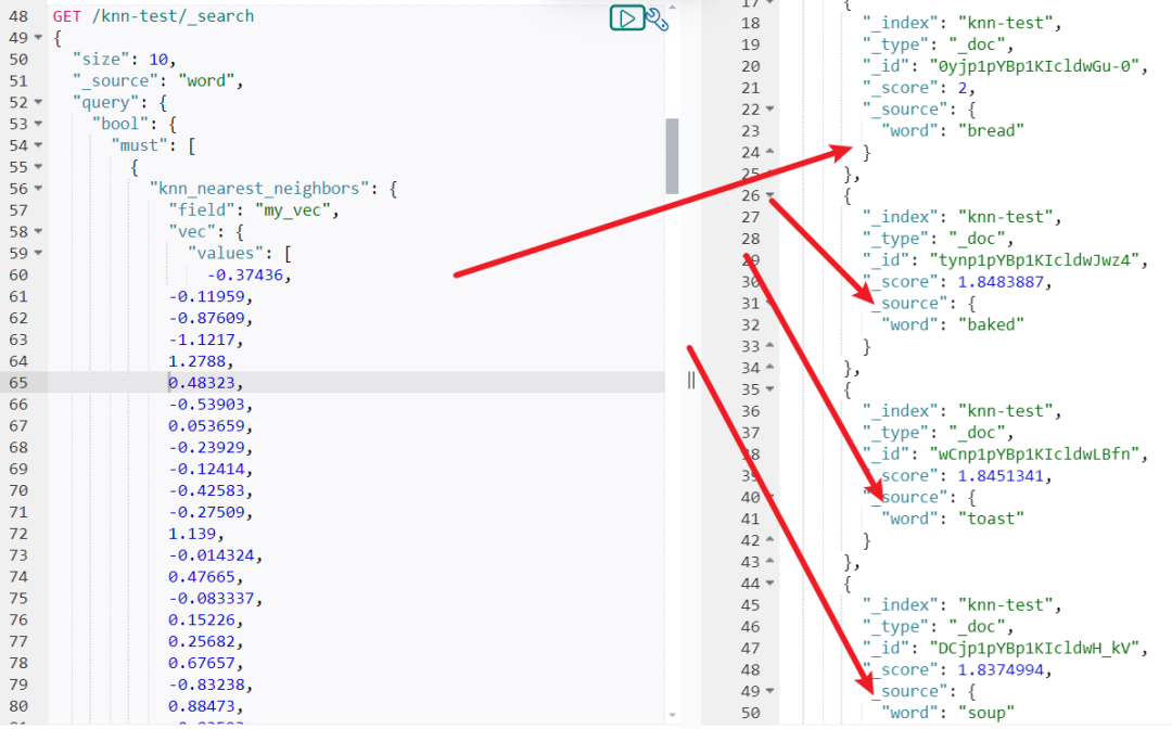 "_index": "knn-test","_type": "_doc","_id": "0yjp1pYBp1KIcldwGu-0","_score": 2,"_source": {"word": "bread"}},{"_index": "knn-test","_type": "_doc","_id": "tynp1pYBp1KIcldwJwz4","_score": 1.8483887,"_source": {"word": "baked"}},{"_index": "knn-test","_type": "_doc","_id": "wCnp1pYBp1KIcldwLBfn","_score": 1.8451341,"_source": {"word": "toast"}},{"_index": "knn-test","_type": "_doc","_id": "DCjp1pYBp1KIcldwH_kV","_score": 1.8374994,"_source": {"word": "soup"}},{"_index": "knn-test","_type": "_doc","_id": "3ijp1pYBp1KIcldwHvdc","_score": 1.8201615,"_source": {"word": "cake"}},