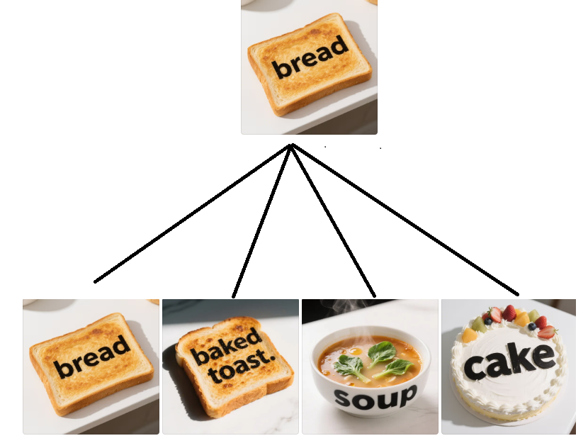 以词语 “bread” 为例,展示向量检索的两个步骤:
