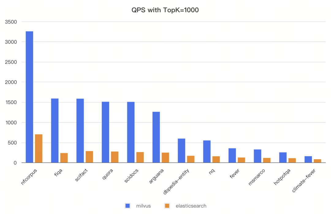 而在 Zilliz Cloud 的云上版本中,我们进一步构建了更加先进的检索框架:在工程实现中引入了 SIMD 加速、数据预取机制等,引入并优化了 Block-Max WAND 与 Block-Max MaxScore 等高性能剪枝算法,相较传统的 WAND/MaxScore,在减少无效计算和内存访问方面效果更佳,从而显著提升了查询效率。以下是我们基于 BEIR 数据集,在 4CU 规格的机器上对 Zilliz Cloud 和 ElasticSearch 在 BM25 检索的 QPS 性能对比: