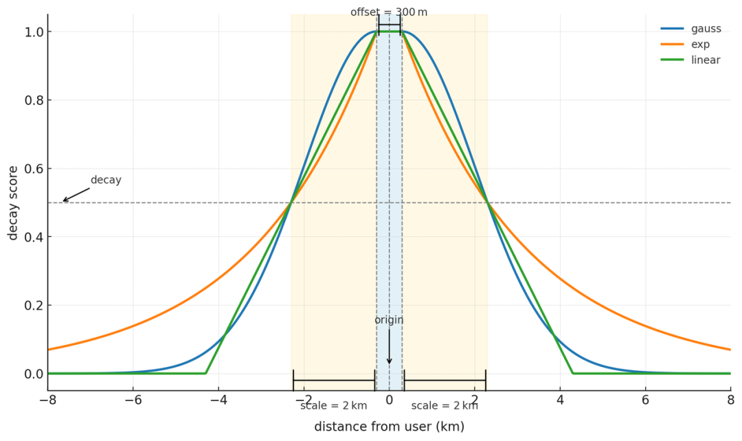 Decay Function 允许用户在获取初步的搜索候选集之后,根据每个条目的时间戳信息,对其原始相关性得分进行调整。其核心思想是,随着时间的推移,信息的价值或相关性可能会逐渐衰减。通过应用一个预定义的衰减函数(例如指数衰减、线性衰减或高斯衰减),系统可以降低较旧条目的得分,同时保持或提升较新条目的得分。这样,在最终呈现给用户的搜索结果中,那些内容相关且时间上更新的条目将更有可能排在靠前的位置。