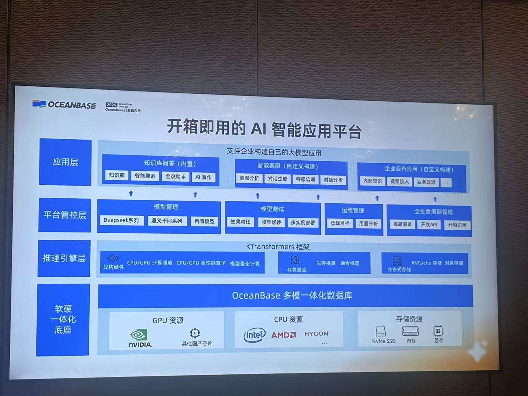 这次Oceanbase的主题是“当SQL遇见AI”,OB发布很多AI相关的特性和产品,如 PowerRAG 开箱即用的RAG,OceanBase AI 一体机等。最近公司在探索本地化部署大模型,但是看了很多厂商,如果要实现本地化部署满血版deepseek 671B基本都要200W+,这还仅仅是硬件投入,而OceanBase AI 一体机仅需1/N的价格就可以本地化部署满血版deepseek,而且还是整体化的解决方案,这无疑是非常有吸引力了。