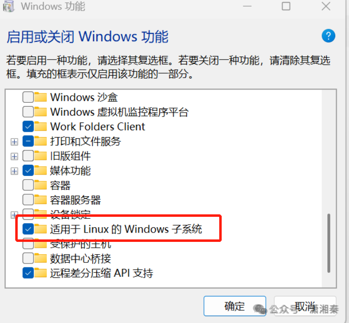 同时按住键盘 Win+Q,搜索 启用或关闭 Windows 功能,打开后下滑找到并勾选 适用于 Linux 的 Windows 子系统 和 虚拟机平台。单击 确定 后重启计算机即可。