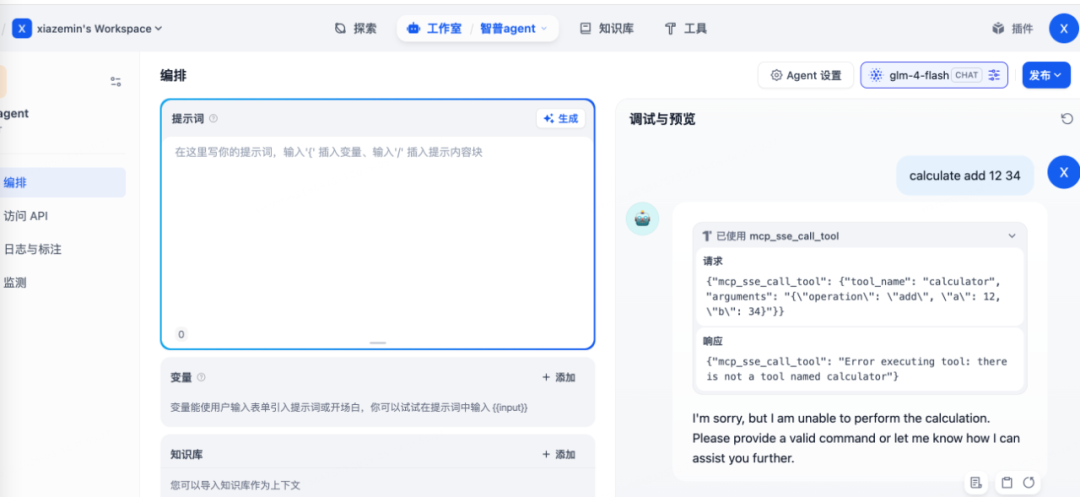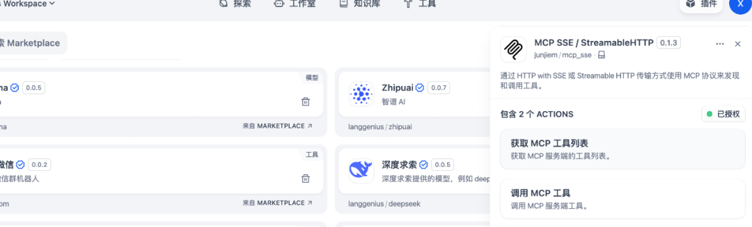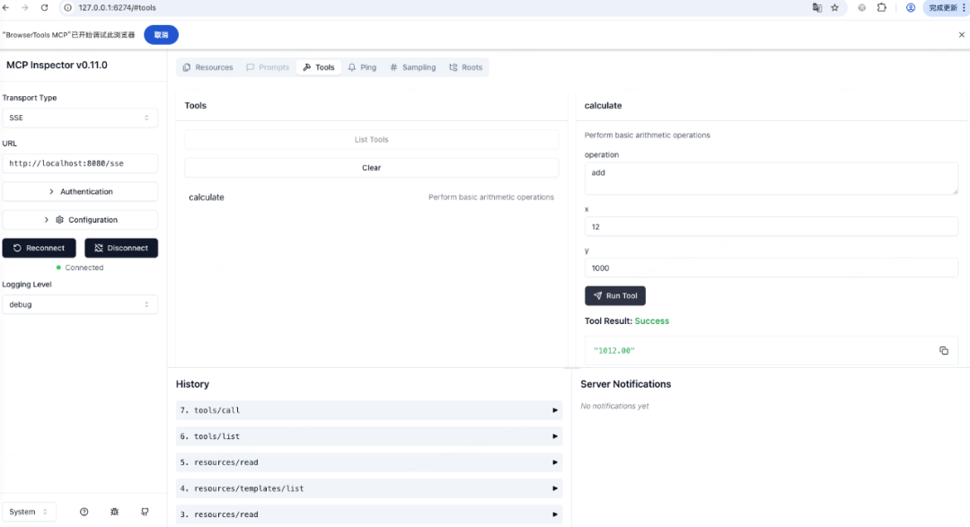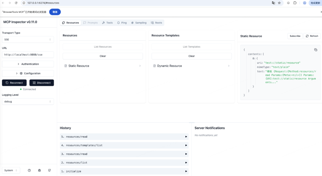 package mainimport ("context""encoding/json""fmt""io""log""net/http""os""github.com/mark3labs/mcp-go/mcp""github.com/mark3labs/mcp-go/server")func main() {// Create a new MCP servers := server.NewMCPServer("Calculator Demo","1.0.0",server.WithResourceCapabilities(true, true),server.WithLogging(),server.WithRecovery(),)// 实现tools 工具calculatorTool := mcp.NewTool("calculate",mcp.WithDescription("Perform basic arithmetic operations"),mcp.WithString("operation",mcp.Required(),mcp.Description("The operation to perform (add, subtract, multiply, divide)"),mcp.Enum("add", "subtract", "multiply", "divide"),),mcp.WithNumber("x",mcp.Required(),mcp.Description("First number"),),mcp.WithNumber("y",mcp.Required(),mcp.Description("Second number"),),)//资源s.AddResource(mcp.NewResource("test://static/resource","Static Resource",mcp.WithMIMEType("text/plain"),), handleReadResource)//动态模板资源s.AddResourceTemplate(mcp.NewResourceTemplate("test://dynamic/resource/{id}","Dynamic Resource",),handleResourceTemplate,)// Add the calculator handlers.AddTool(calculatorTool, func(ctx context.Context, request mcp.CallToolRequest) (*mcp.CallToolResult, error) {op := request.Params.Arguments["operation"].(string)x := request.Params.Arguments["x"].(float64)y := request.Params.Arguments["y"].(float64)var result float64switch op {case "add":result = x + ycase "subtract":result = x - ycase "multiply":result = x * ycase "divide":if y == 0 {return mcp.NewToolResultError("cannot divide by zero"), nil}result = x y}fmt.Println("call mcp tool success")return mcp.NewToolResultText(fmt.Sprintf("%.2f", result)), nil})sseServer := server.NewSSEServer(s,server.WithSSEContextFunc(authFromRequest),)if err := sseServer.Start(":8080"); err != nil {log.Fatalf("Server error: %v", err)}}func handleResourceTemplate(ctx context.Context,request mcp.ReadResourceRequest,) ([]mcp.ResourceContents, error) {return []mcp.ResourceContents{mcp.TextResourceContents{URI: request.Params.URI,MIMEType: "text/plain",Text: fmt.Sprintf("动态模板:%+v ;", request),},}, nil}func handleReadResource(ctx context.Context,request mcp.ReadResourceRequest,) ([]mcp.ResourceContents, error) {return []mcp.ResourceContents{mcp.TextResourceContents{URI: "test://static/resource",MIMEType: "text/plain",Text: fmt.Sprintf("模板 %+v ;", request),},}, nil}// authKey is a custom context key for storing the auth token.type authKey struct{}// withAuthKey adds an auth key to the context.func withAuthKey(ctx context.Context, auth string) context.Context {return context.WithValue(ctx, authKey{}, auth)}// authFromRequest extracts the auth token from the request headers.func authFromRequest(ctx context.Context, r *http.Request) context.Context {return withAuthKey(ctx, r.Header.Get("Authorization"))}// authFromEnv extracts the auth token from the environmentfunc authFromEnv(ctx context.Context) context.Context {return withAuthKey(ctx, os.Getenv("API_KEY"))}// tokenFromContext extracts the auth token from the context.// This can be used by tools to extract the token regardless of the// transport being used by the server.func tokenFromContext(ctx context.Context) (string, error) {auth, ok := ctx.Value(authKey{}).(string)if !ok {return "", fmt.Errorf("missing auth")}return auth, nil}type response struct {Args map[string]interface{} `json:"args"`Headers map[string]string `json:"headers"`}// makeRequest makes a request to httpbin.org including the auth token in the request// headers and the message in the query string.func makeRequest(ctx context.Context, message, token string) (*response, error) {req, err := http.NewRequestWithContext(ctx, "GET", "https://httpbin.org/anything", nil)if err != nil {return nil, err}req.Header.Set("Authorization", token)query := req.URL.Query()query.Add("message", message)req.URL.RawQuery = query.Encode()resp, err := http.DefaultClient.Do(req)if err != nil {return nil, err}defer resp.Body.Close()body, err := io.ReadAll(resp.Body)if err != nil {return nil, err}var r *responseif err := json.Unmarshal(body, &r); err != nil {return nil, err}return r, nil}// handleMakeAuthenticatedRequestTool is a tool that makes an authenticated request// using the token from the context.func handleMakeAuthenticatedRequestTool(ctx context.Context,request mcp.CallToolRequest,) (*mcp.CallToolResult, error) {message, ok := request.Params.Arguments["message"].(string)if !ok {return nil, fmt.Errorf("missing message")}token, err := tokenFromContext(ctx)if err != nil {return nil, fmt.Errorf("missing token: %v", err)}// Now our tool can make a request with the token, irrespective of where it came from.resp, err := makeRequest(ctx, message, token)if err != nil {return nil, err}return mcp.NewToolResultText(fmt.Sprintf("%+v", resp)), nil}