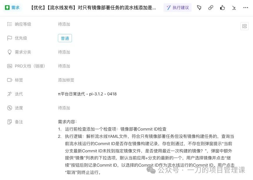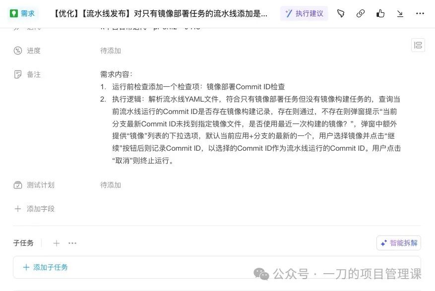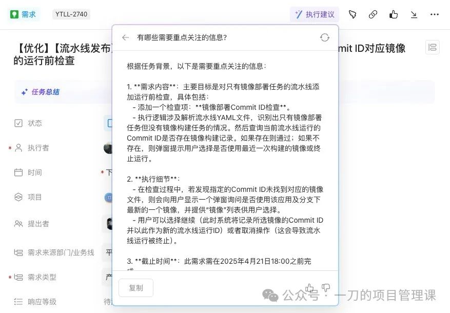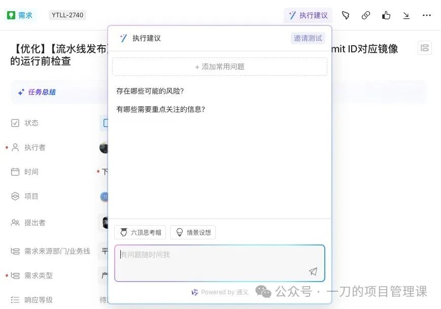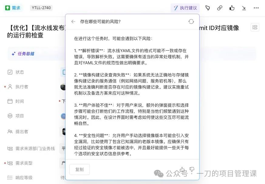 来看看应用案例,首先是Teambition,其在需求任务中添加了“执行建议”的AI能力,可以帮助分析需求任务的潜在风险和重点关注的内容。