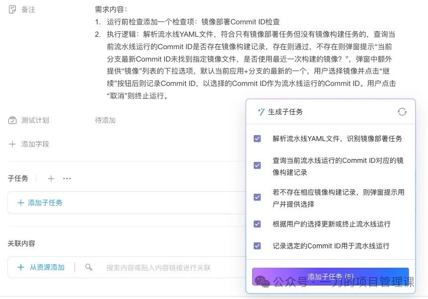 在Teambition中,有了需求任务的描述,子任务是可以通过AI进行智能拆解的,拆解完成后可以直接生成任务。